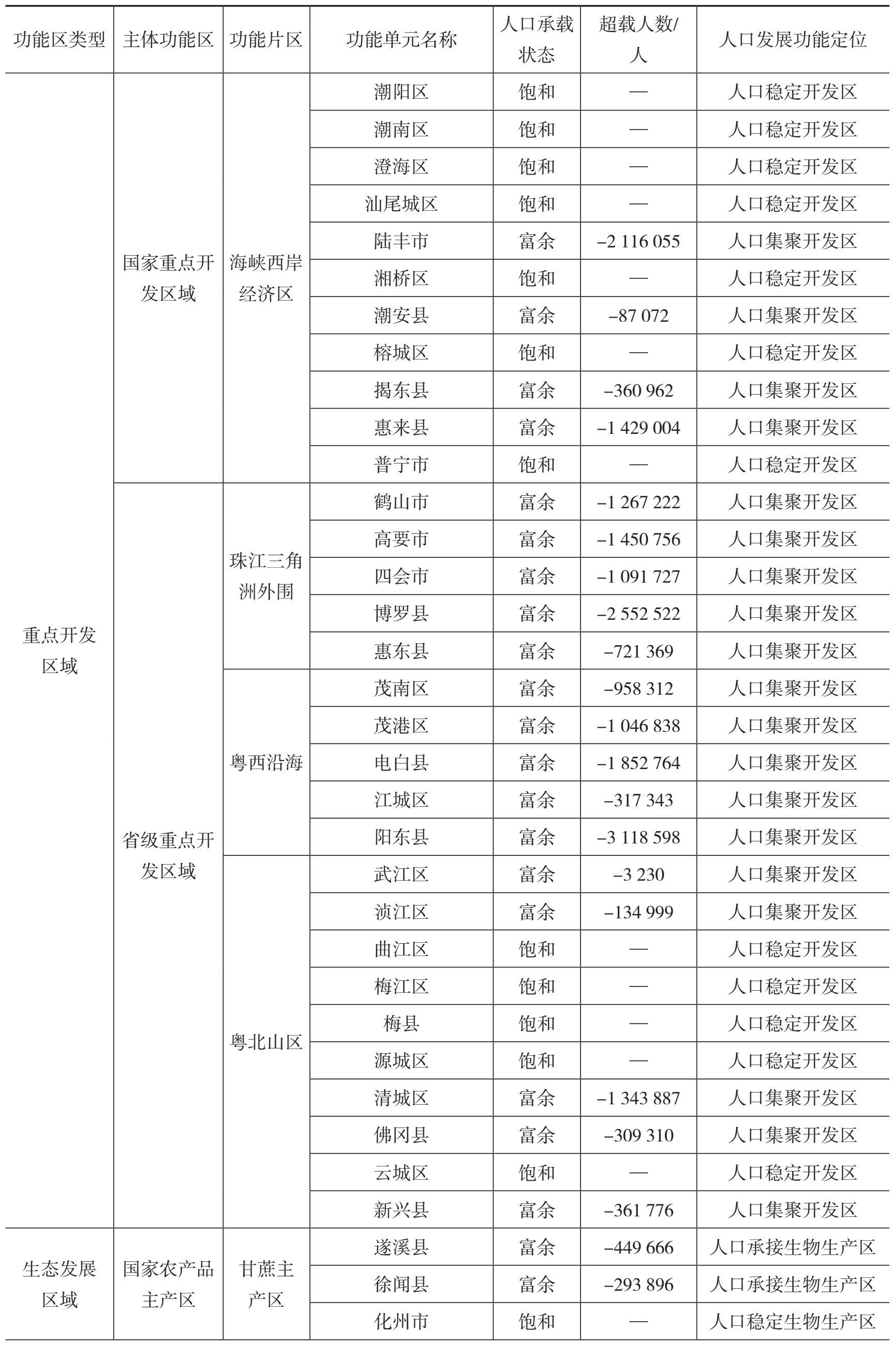 重点开发区域内有26个功能单元区(分别是湛江市的坡头区、麻章区,廉江市,吴川市,汕头市的濠江区、澄海区,陆丰市,潮安县,揭东县,惠来县,鹤山市,高要市,四会市,博罗县,惠东县,茂名市的茂南区、茂港区、电白县,阳江市的江城区、阳东县,韶关市的武江区、浈江区,清远市的清城区,梅县,佛冈县和新兴县)人口承载力有富余,属于人口集聚开发区,目前还可吸纳3 235万人。湛江市赤坎区、霞山区,汕头市龙湖区、金平区、潮阳区和潮南区,汕尾城区,潮州市湘桥区,揭阳市榕城区,普宁市,韶关市曲江区,梅州市梅江区和河源市源城区,云浮市云城区等14个功能单元人口容量已经处于饱和状态,属于人口稳定开发区。全部重点开发区域合计还可以吸纳3 235万人,其中国家级重点开发区域可以吸纳1 582万人,省级重点开发区域可以吸纳1 653万人。国家级重点开发区域的富余人口容量主要在粤西北部湾经济圈地区,有1 183万人口的富余容量,而隶属于海峡西岸经济区的粤东片的富余人口容量只有约400万人。省级重点开发区域的富余人口容量主要在粤西沿海和珠江三角洲外围,分别有富余人口容量723万人和708万人,而粤北山区的重点开发区域的富余人口容量合计只有215万人。