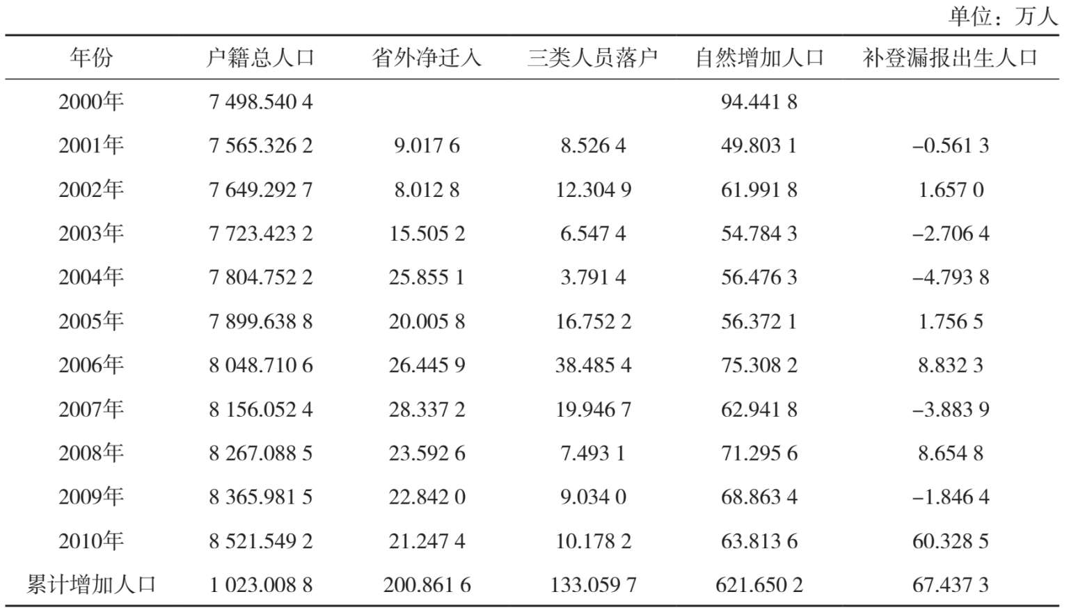 注:本表数据引自公安部治安管理局编《中华人民共和国全国分县市人口统计资料(2000—2010年)》 ,北京:群众出版社。其中三类公民落户人数是省内净迁入人口数,补登漏报的出生人口数上推算结果。