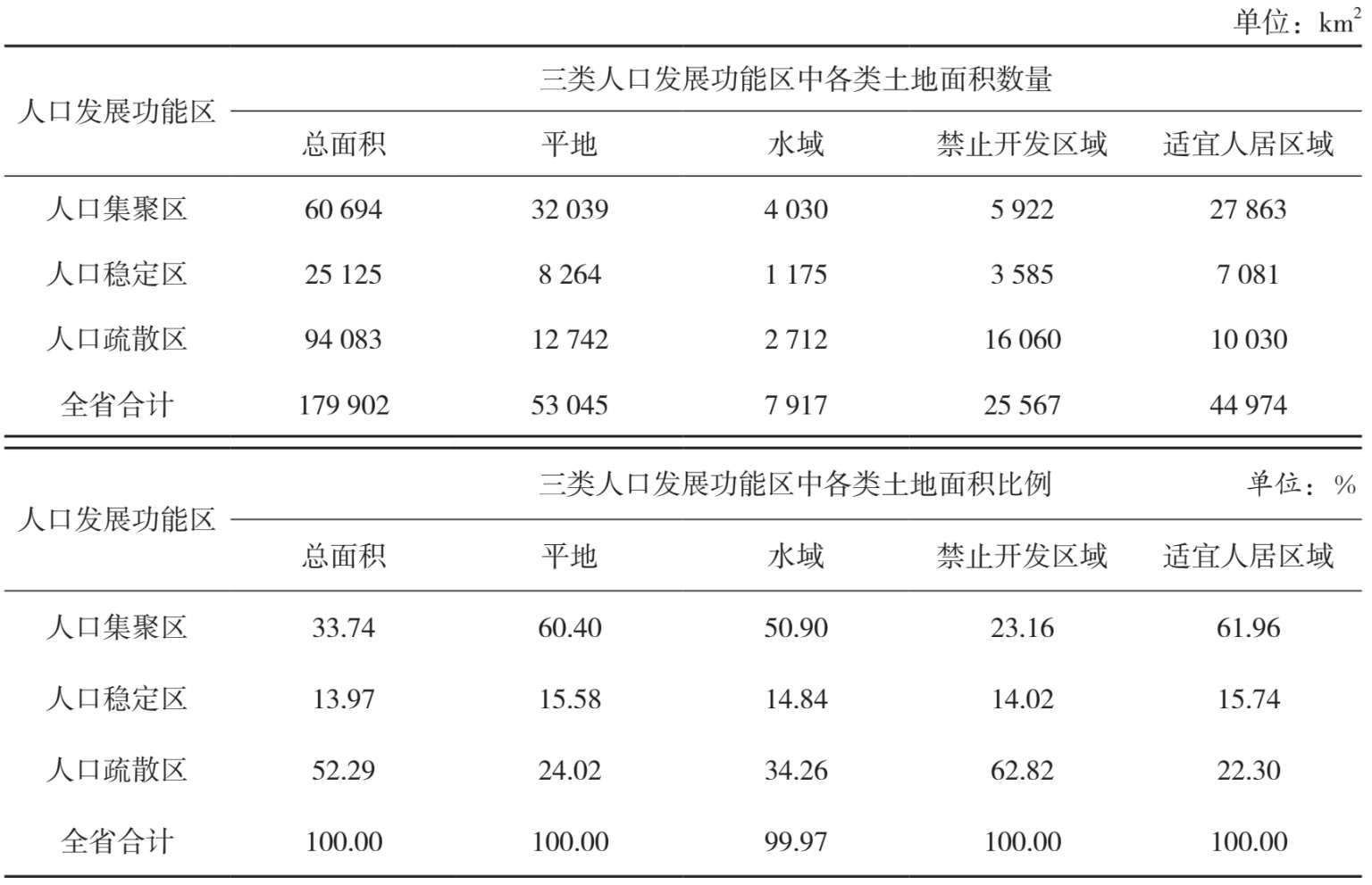 三类人口发展功能区的各类土地面积数量与比例见表2-38。从国土总面积的分配看,人口集聚区总面积为60 694km 2 ,占全省总面积的33.74%;人口稳定区总面积为25 125km 2 ,占全省总面积的13.97%;人口稳疏散区总面积为94 083km 2 ,占全省总面积的52.29%。但是从适宜人居区域面积分布情况看,人口集聚区适宜人居区域总面积为27 863km 2 ,占全省适宜人居区域总面积的61.96%;人口稳定区适宜人居区域总面积为7 081km 2 ,占全省适宜人居区域总面积的15.74%;人口疏散区适宜人居区域总面积为10 030km 2 ,占全省适宜人居区域总面积的22.30%。全省62.82%的禁止开发区域(也就是人口限制区)分布在人口疏散区内。