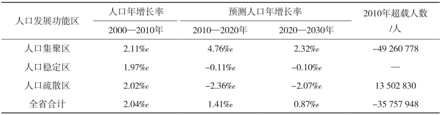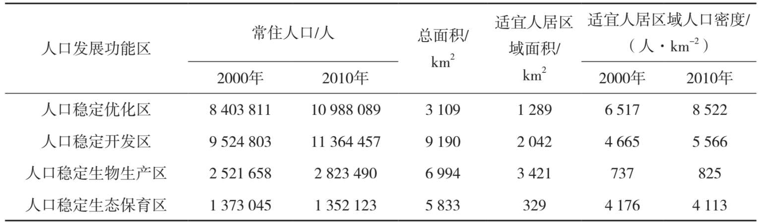 人口疏散区在过去集聚了太多的人口,2000—2010年的人口年增长率达2.02‰,略低于全省人口年增长率(2.04‰),但是到2010年,其人口密度到已经超出了当地资源承载能力的极限。而人口集聚区在2000—2010年的人口年增长率达2.11‰,明显高于全省人口年增长率(2.04‰),但是其人口承载能力还有大量富余,是进一步集聚人口,深入开发其人文发展功能的好地方。人口稳定区的人口密度已经达到饱和状态,在2000—2010年的人口年增长率只有1.97‰,明显低于全省人口年增长率(2.04‰),今后应该进一步控制其人口数量的增长,直至其人口数量稳定下来。
