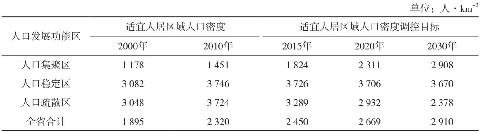 表2-39 三类人口发展功能区适宜人居区域人口密度及其调控目标