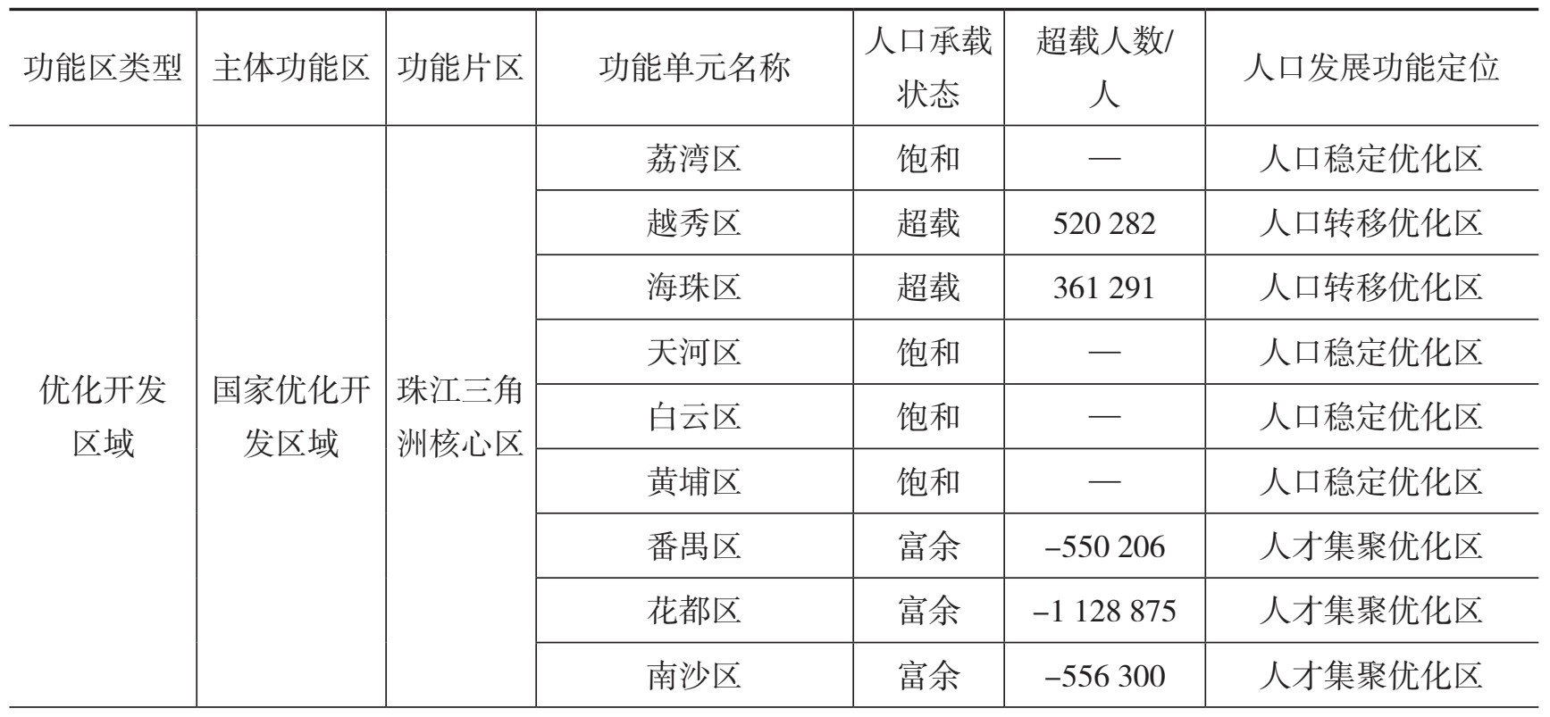 优化开发区域内有7个功能区单元区(广州市的越秀区、海珠区、深圳市的罗湖区、福田区、南山区和宝安区以及东莞市)人口明显超载,合计有314万人口需要转移疏散,属于人口疏散优化区。广州市的荔湾区、天河区、白云区、黄埔区、深圳市的龙岗区、盐田区、珠海市的香洲区,佛山市的禅城区,江门市的蓬江区、江海区和肇庆市的端州区等11个功能单元人口容量处于饱和状态,今后发展过程中需要在人口规模保持稳定的情况下优化发展,属于人口稳定优化区。另外的17个功能单元(广州市的番禺区、花都区、南沙区、萝岗区,增城市和从化市,珠海市的斗门区、金湾区,佛山市的南海区、顺德区、三水区和高明区,江门市的新会区,肇庆市的鼎湖区,惠州市的惠城区和惠阳区以及中山市)人口承载力还有富余,合计还可接纳1 411万人口,可以利用这个人口容量空间集聚人才,属于人才集聚优化区。全部优化开发区域内部调整后还可以吸纳1 097万人口。也就是说优化开发区域在转型提质过程中还有1 097万人口的腾挪空间。