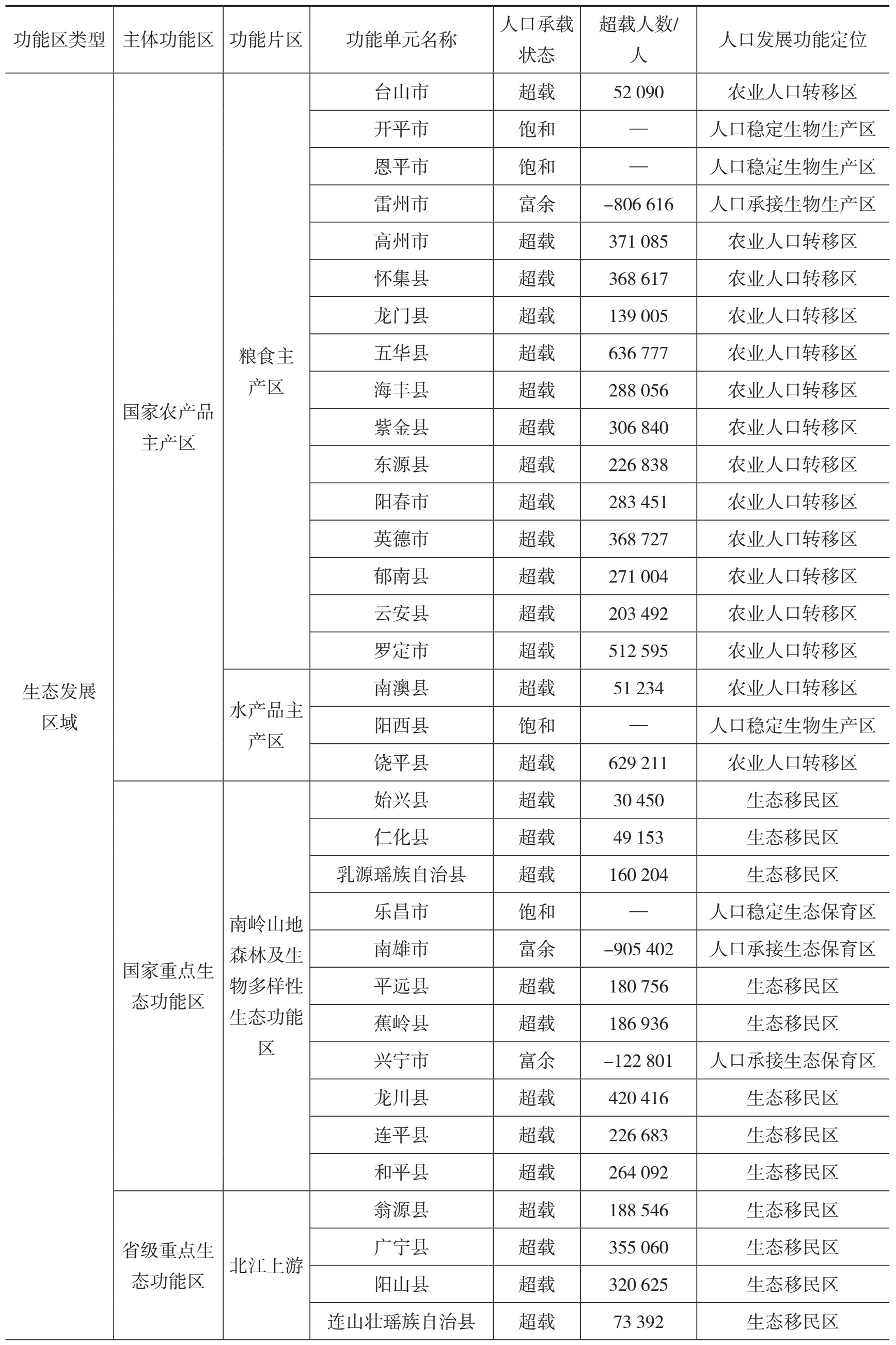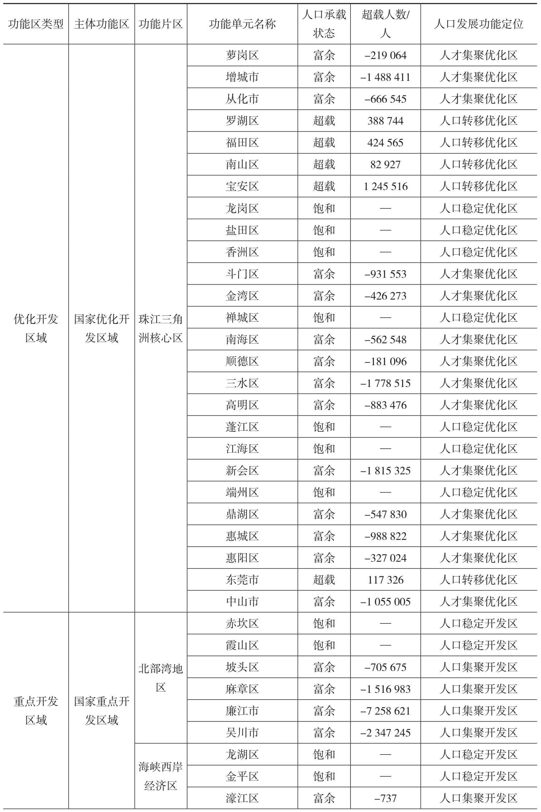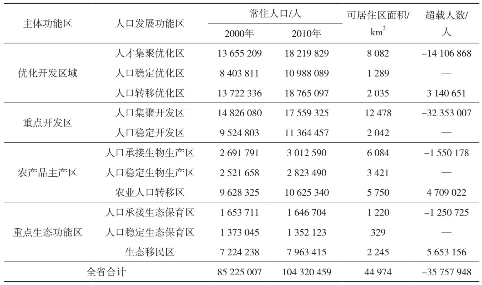各类主体功能区的人口发展功能定位与常住人口数量及其超载人数汇总于表2-35。