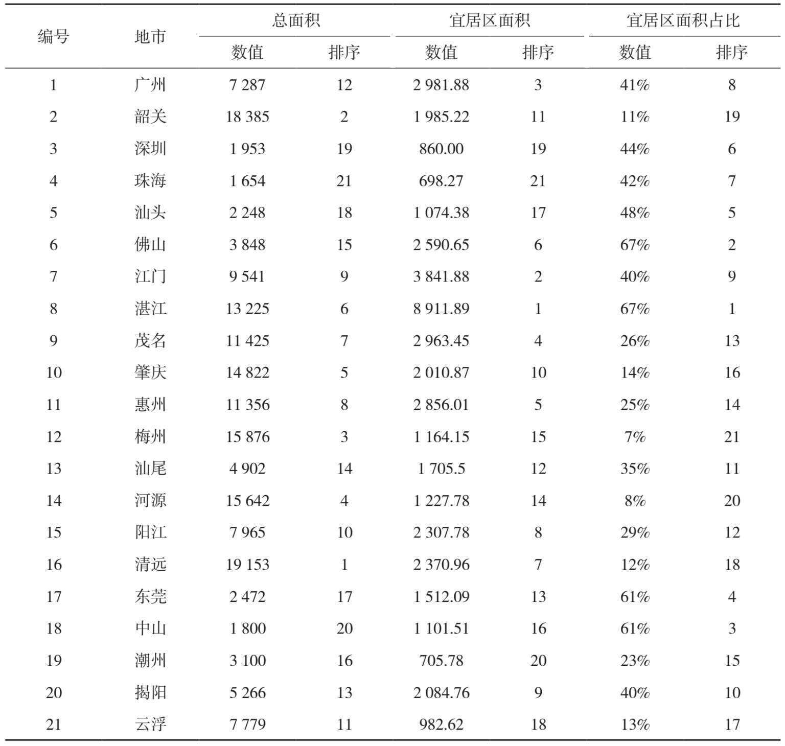 结合以上的增补,最终确定了广东省21市的宜居区面积,如表3-1所示: