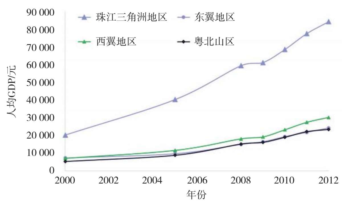 图3-3 2000-2012年广东省珠江三角洲地区、东翼地区、西翼地区、粤北山区人均GDP变化