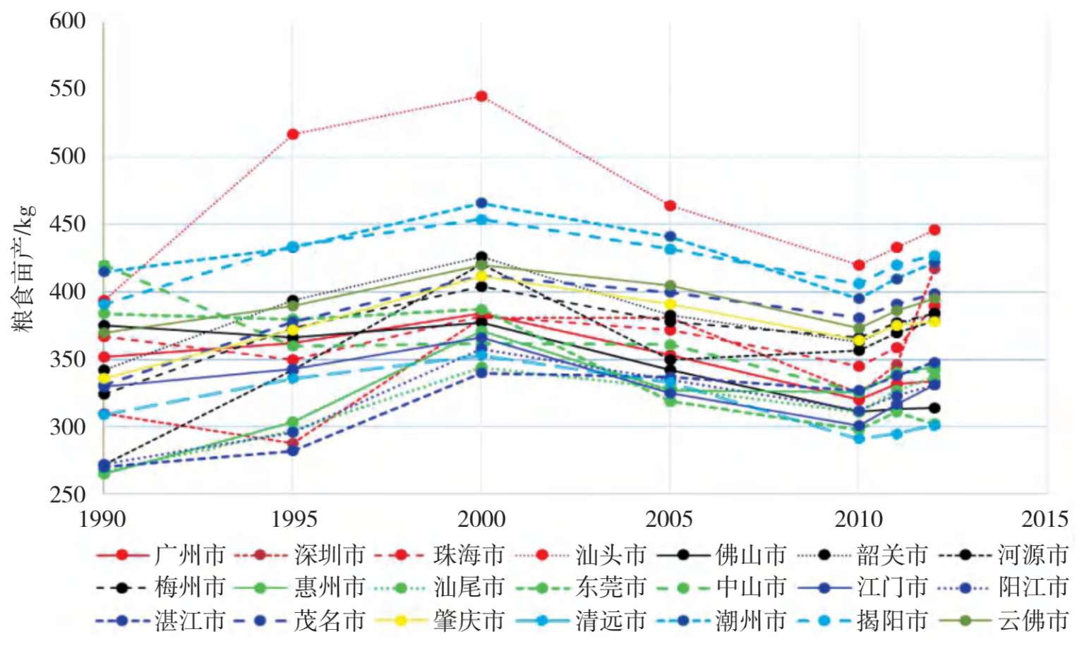图3-2 1990年以来广东省21市粮食亩产变化图