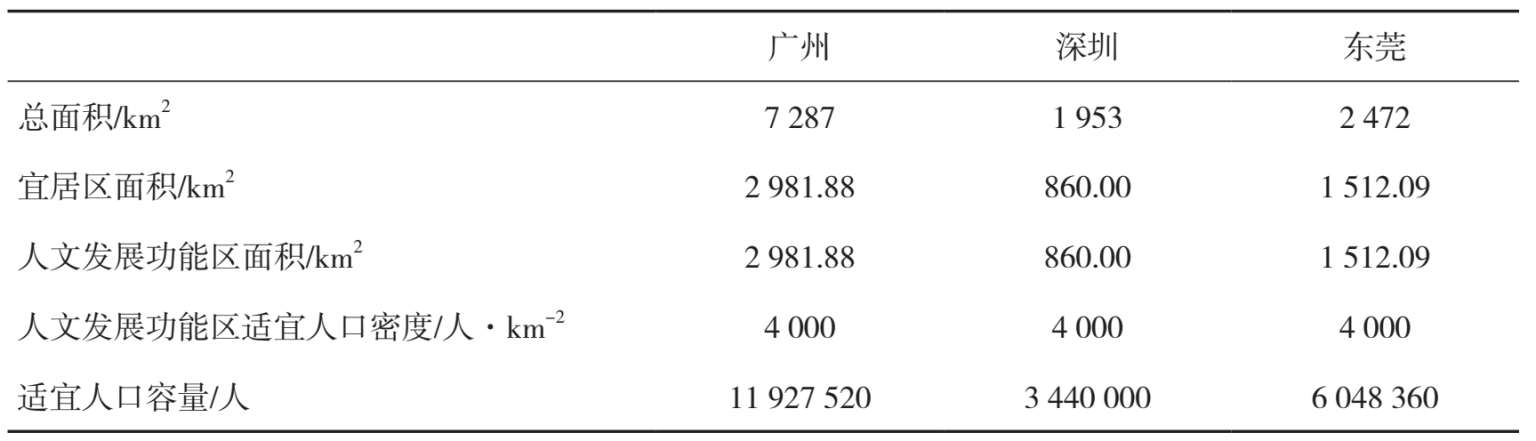 表3-3 广州、深圳、东莞3个市的适宜人口容量计算结果