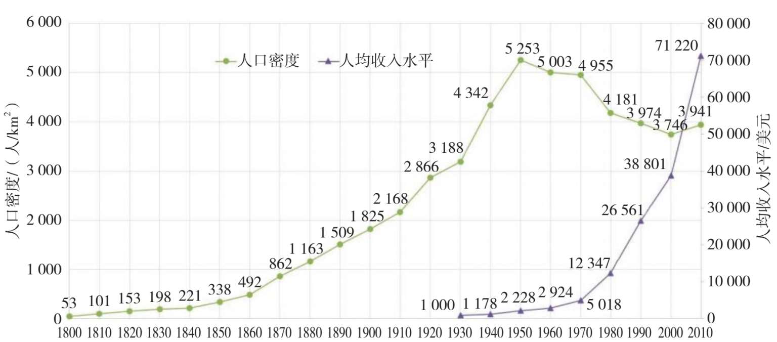 以美国的华盛顿特区为例,对其自1800年以来的人口数据和自1930年以来的人均收入水平数据进行分析,如图3-4所示。不难发现,随着人均收入的提升,华盛顿特区的人口密度经历了先上升后下降再稳定的过程。具体来说,当人均收入水平在2 000美元以下时,宜居区人口密度处于增长阶段,其中1800—1840年增长较为缓慢,1840—1930年增长速度加快。1930—1950年属于人口高速增长阶段;当人均收入处于2 000~5 000美元时,宜居区人口密度达到最大值并总体处于稳定阶段;当人均收入处于5 000~40 000美元时,人口密度总体进入下降阶段;当人均收入达到40 000美元以上时,人口密度基本稳定下来,并且根据本书第二章的分析,这时的人口密度比较有利于人地关系的协调。