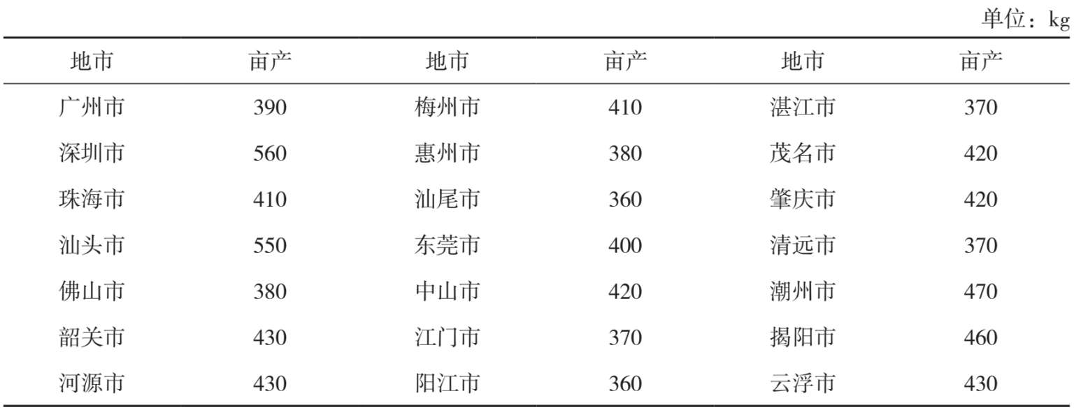 基于以上分析,将广东省的21市分成2个部分来确定人均粮食消费量。将珠江三角洲9个地市的人均粮食消费量确定为450kg,这9市为珠江沿岸的广州、深圳、佛山、珠海、东莞、中山、惠州、江门、肇庆。将东西两翼及粤北山区的人均粮食消费量确定为430kg,其中东翼地区包括汕头、潮州、揭阳、汕尾4市,西翼地区包括湛江、茂名、阳江3市,粤北山区包括韶关、梅州、清远、河源和云浮5市。