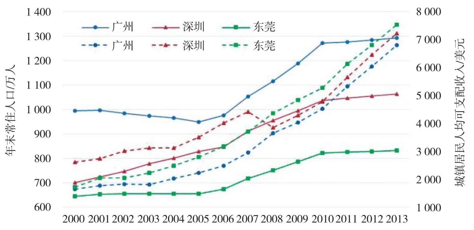 图3-5 广州、深圳、东莞3市2000年以来的人口及城镇居民可支配收入变化