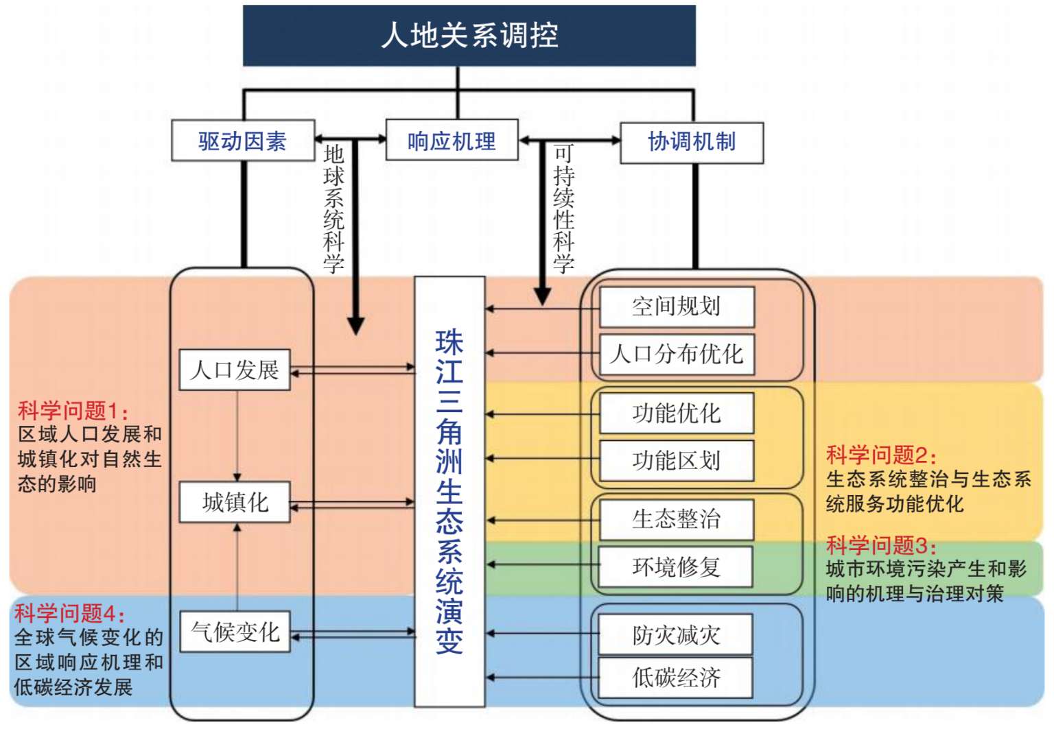 粤港澳大湾区地处南海北岸的珠江三角洲及其邻近地带,是我国人类活动强度最大的三大地域单元之一,在过去40余年超常规高速发展的过程中,生态空间被大规模挤占,人地矛盾突显,这主要表现为:区域人口发展和城镇化对自然生态的影响不断加剧,淡水资源的供应难以为继,环境承载力难以为继,人口容量难以为继,以土地扩张为主的传统发展模式难以为继。这些问题极大地影响了粤港澳大湾区城市群的转型升级和优质生活圈的建设。从区域层面考虑,生产、生活、生态“三生”空间结构性失衡,生态系统亟待整治,生态系统服务功能急需优化;从面对的现实问题考虑,为了给2010年广州亚运会召开营造良好大气环境,急需灰霾防治的中长期对策和应急措施;从长远和全局层面考虑,必须应对全球气候变化和尽快转入低碳经济发展轨道。人地关系协调成为高层决策机构高度关注的重大课题。珠江三角洲环境要素复杂,胁迫因素多,研究探索珠江三角洲的人地关系协调机制迫切需要系统的、针对性强的理论与方法。很多学者从不同的视角、运用各种理论对珠江三角洲的人地关系协调问题进行了多方面的考察和研究。但是它们大多是短(研究历时短)、平(研究的往往是一般性、普遍性的问题)、快(关注的焦点随热点快速转换)的研究。我们从1995年开始就在孙大中院士的带领下研究和探索珠江三角洲社会经济发展的可持续性问题,2006年完成了“广东省资源环境与可持续发展监测评价综合研究”,建立了系统集成的区域可持续发展研究理论与方法技术体系。在广东省自然科学基金团队项目的支持下,从2004年开始,我们着手开展了“珠江三角洲人地系统演进与人地关系协调研究”。随后,我们配合《广东省主体功能区规划》的制定和实施,在广东省人口和计划生育委员会和国务院人口普查领导小组办公室的支持下,开展了“与主体功能区对接的广东省人口发展功能区研究”等一系列相关课题的研究。同时我们还获得了国家自然科学基金项目“环珠江口区域城市扩张及其环境生态效应分析与模拟”,以及广东省科技厅和广州市、东莞市、珠海市等城市政府委托的项目的支持。基于这些课题经费的支持,我们运用新兴的地球系统科学与可持续性科学的理论和方法,对粤港澳大湾区在人地关系协调领域面临的四大关键科学问题展开了历时十多年的深入研究,取得了一系列具有创新性的认识,为各级政府部门提供了大量的决策咨询建议,产生了巨大的社会效益。这些成果对提高粤港澳大湾区尤其是珠江三角洲城市群社会经济发展的规划水平,优化人口空间布局与区域功能布局,促进区域生态系统的整治与功能优化,建设生态安全、环境优美、社会安定、文化繁荣的美丽湾区具有重大意义。