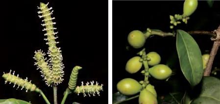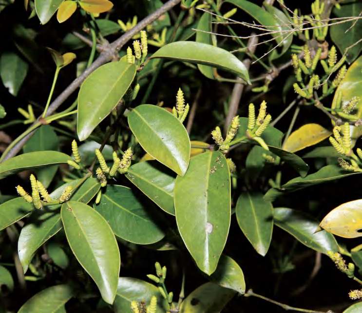 缠绕藤本。叶椭圆形等,革质,基部宽楔形。成熟种子假种皮红色,长椭圆形等,先端常有小尖头,种脐近圆形,无柄或近无柄。花期6—7月,果期8—9月。前进、锦潭、横石塘、云岭、沙口管理站均有分布。韧皮部纤维可用于编制绳索,种子炒后可食用或榨油。