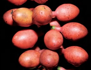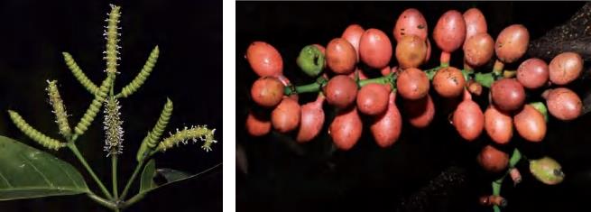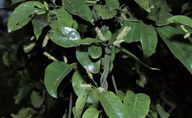 缠绕藤本。叶椭圆形等,革质,基部宽楔形。成熟种子假种皮红色,长椭圆形等,先端常有小尖头,种脐近圆形,无柄或近无柄。花期6—7月,果期8—9月。前进、锦潭、横石塘、云岭、沙口管理站均有分布。韧皮部纤维可用于编制绳索,种子炒后可食用或榨油。