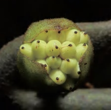 攀援灌木。果实和叶背被稀疏绒毛,其余无毛。叶纸质,长圆形,顶端急尖,基部圆形或宽楔形,叶背淡黄色,干后红黄色。花黄色,有香气,1~2朵聚生于叶腋;萼片卵圆形;外轮花瓣比内轮花瓣长,无毛,卵状三角形,内轮花瓣狭长;药隔三角形;心皮被绒毛,柱头顶端全缘。果圆球状,成熟时黑色,被短绒毛。花期3—6月,果期6—12月。前进、横石塘管理站更古、石门台有分布。叶可制酒饼药,果味甜可食。