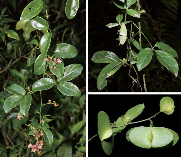 藤本。幼枝被金黄褐色绒毛,指状复叶互生,有小叶3片;叶柄密被金黄褐色绒毛。小叶纸质,卵形等,先端钝,基部圆形或近心形,全缘;小叶柄密被金黄褐色绒毛。聚伞花序组成的圆锥花序腋生,密被金黄褐色绒毛;花瓣与萼片同形,稍短,玫瑰红色;雄蕊5枚,被毛;附属物花瓣状,膜质;花柱被黄色绒毛,柱头波状扩大成鸡冠状;花盘上腺体5个,小。果具4翅。花期9—10月,果期12月至翌年4—5月。前进、锦潭、云岭管理站乌田、八宝、水头有分布。 pwwdaScoDAYkAsux1IXMmK66gZPaTffTr9Ryu7Q6GxAugNBWt3jVaXCi8O7bZnGn