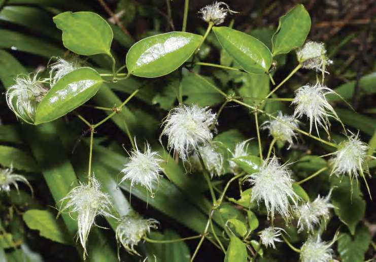 别名甘木通。木质藤本。三出复叶,无毛;小叶片纸质,卵圆形等,顶端钝圆,基部宽楔形等,全缘,基出掌状脉5条。腋生圆锥花序或总状花序,常具7~12朵花;萼片4枚,白色,窄卵形或卵状披针形,外面有锈褐色或淡褐色绒毛,内面无毛,顶端钝圆;雄蕊外轮较长,内轮较短;心皮在开花时有白色绵毛,花柱有短绒毛。瘦果狭卵形,常偏斜,棕色,宿存花柱丝状,有开展长绒毛。花期11—12月,果期翌年1—2月。锦潭管理站长江有分布。叶供药用,对治疗高血压病及冠心病有较好的疗效。