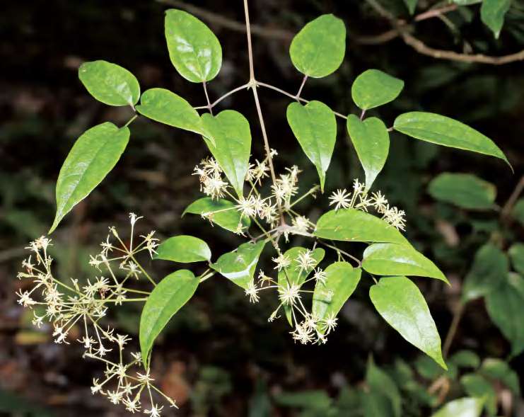 别名甘木通。木质藤本。三出复叶,无毛;小叶片纸质,卵圆形等,顶端钝圆,基部宽楔形等,全缘,基出掌状脉5条。腋生圆锥花序或总状花序,常具7~12朵花;萼片4枚,白色,窄卵形或卵状披针形,外面有锈褐色或淡褐色绒毛,内面无毛,顶端钝圆;雄蕊外轮较长,内轮较短;心皮在开花时有白色绵毛,花柱有短绒毛。瘦果狭卵形,常偏斜,棕色,宿存花柱丝状,有开展长绒毛。花期11—12月,果期翌年1—2月。锦潭管理站长江有分布。叶供药用,对治疗高血压病及冠心病有较好的疗效。
