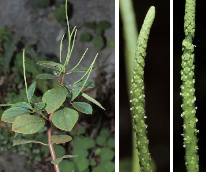 别名豆瓣菜、豆瓣如意。肉质、丛生草本;茎匍匐,多分枝,下部节上生根,节间有粗纵棱。叶密集,大小近相等,4或3片轮生,带肉质,有透明腺点,阔椭圆形或近圆形,两端钝或圆形;叶脉3条,常不明显;叶柄短。穗状花序单生,顶生和腋生;总花梗被疏毛或近无毛,花序轴密被毛;子房卵形,生于花序轴凹陷处,柱头顶生,近头状,被短绒毛。浆果近卵形,顶端尖。花期11至翌年3月。锦潭管理站联山有分布。全草可入药。