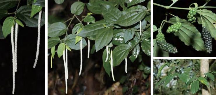 木质攀援藤本。叶厚纸质,花枝下部叶阔卵形或卵形,顶端短尖,基部常心形,两侧相等,上部叶卵形等,顶端渐尖,基部钝形;基出脉5~7条,对生;下部叶柄长,上部叶柄短。花单性,雌雄异株,聚集穗状花序。雄花序圆柱形,顶端钝,白色;雄花序苞片圆形,无柄,盾状,雄蕊2枚。雌花序白色,总花梗与花序近等长;苞片与雄花序的相同;子房基部嵌生于花序轴中,柱头3~4裂,被绒毛。浆果球形,基部嵌生于花序轴中。花期6月,果期11月至翌年3月。横石塘管理站石门台有分布。