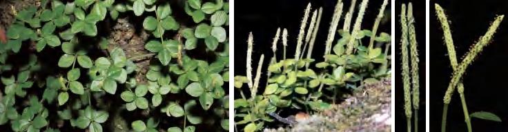 别名豆瓣菜、豆瓣如意。肉质、丛生草本;茎匍匐,多分枝,下部节上生根,节间有粗纵棱。叶密集,大小近相等,4或3片轮生,带肉质,有透明腺点,阔椭圆形或近圆形,两端钝或圆形;叶脉3条,常不明显;叶柄短。穗状花序单生,顶生和腋生;总花梗被疏毛或近无毛,花序轴密被毛;子房卵形,生于花序轴凹陷处,柱头顶生,近头状,被短绒毛。浆果近卵形,顶端尖。花期11至翌年3月。锦潭管理站联山有分布。全草可入药。