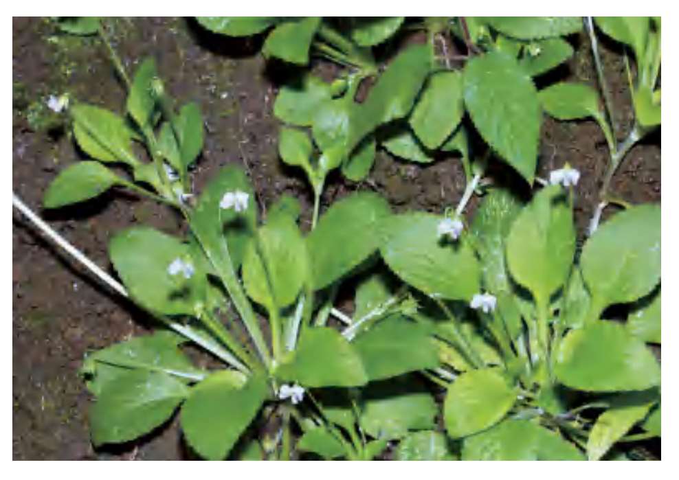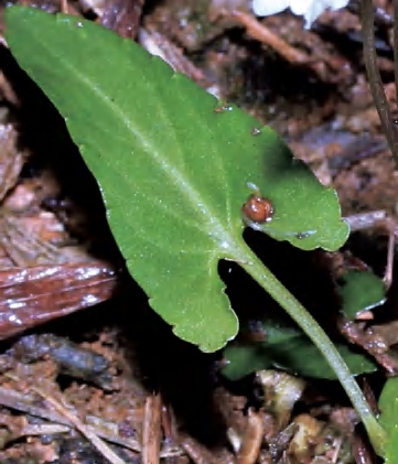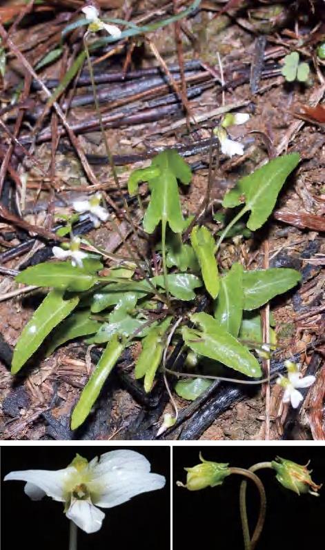 多年生草本。叶基生,莲座状;叶片狭披针形等,先端尖,基部截形或略呈浅心形,基部垂片开展并具明显牙齿。花白色或淡紫色,有深色条纹;花梗细长,常无毛;萼片卵状披针形或狭卵形,基部附属物较短,末端圆形,具3条脉;上方花瓣倒卵形,侧方花瓣长圆状倒卵形,里面基部密生或有时生较少量的须毛;距管状,稍短而粗,末端圆形;子房卵球形,无毛。蒴果椭圆形。花果期4—9月。前进管理站乌田有分布。全草可入药,可清热解毒、消肿散瘀。