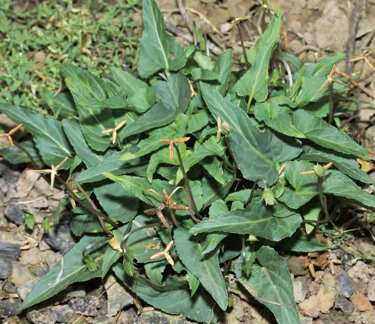别名蔓茎堇菜、茶匙黄。一年生草本,全体被糙毛。基生叶多数,丛生呈莲座状;叶卵形等,先端钝或稍尖,基部宽楔形等,明显下延于叶柄,边缘具钝齿及缘毛,幼叶两面密被白色绒毛;叶柄具明显的翅,常有毛。花较小,淡紫色或浅黄色,具长梗;萼片披针形,先端尖,基部附属物短;子房无毛,花柱棍棒状。蒴果长圆形,无毛,顶端常具宿存花柱。花期3—5月,果期5—8月。前进、锦潭管理站乌田、八宝有分布。全草可入药,具有清热解毒的功效。