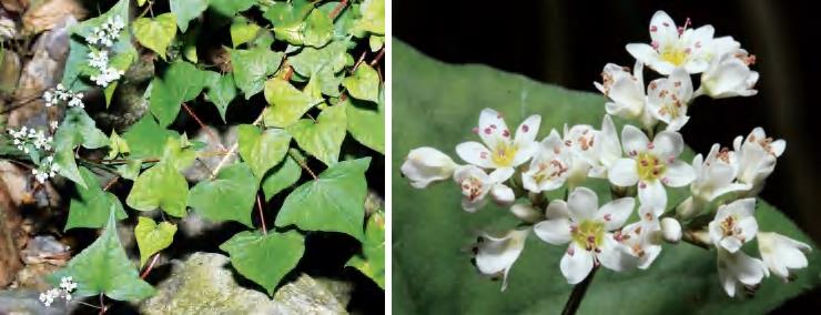 多年生草本。叶三角形,顶端渐尖,基部近戟形,边缘全缘;托叶鞘筒状,膜质,褐色,偏斜,顶端截形,无缘毛。花序伞房状,顶生或腋生;苞片卵状披针形,顶端尖,边缘膜质,每苞内具2~4朵花;花梗中部具关节;花被5深裂,白色,雄蕊8枚,花柱3枚,柱头头状。瘦果宽卵形,具3条锐棱,黑褐色。花期7—9月,果期8—10月。锦潭、横石塘、云岭、沙口管理站均有分布。块根可入药,具有清热解毒、排脓去瘀的功效。国家Ⅱ级重点保护野生植物。