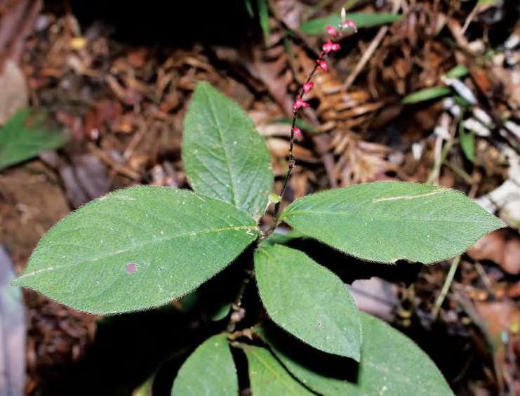 多年生草本。叶椭圆形或长椭圆形,顶端短渐尖或急尖,基部楔形,全缘,两面均具粗糙伏毛;叶柄具粗糙伏毛;托叶鞘筒状,膜质,褐色,具短缘毛。总状花序呈穗状,常数个顶生或腋生;花被4深裂,红色,花被片卵形,结果时稍增大;雄蕊5枚;花柱2枚,结果时伸长,硬化,顶端呈钩状,宿存,伸出花被之外。瘦果卵形,双凸镜状,包于宿存花被内。花期7—8月,果期9—10月。前进、锦潭、横石塘、云岭、沙口管理站均有分布。