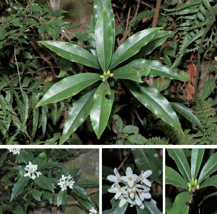 常绿灌木。叶互生,密集于小枝顶端,膜质或纸质,长椭圆形等,先端钝或渐尖,基部楔形,边缘全缘。花白色,多簇生于小枝顶端成头状花序;花序梗短,与花梗密被黄绿色丝状毛;花萼筒漏斗状,外面具淡黄色丝状绒毛,裂片4枚;雄蕊8枚,2轮,花丝短,花药1/3伸出喉部外;子房圆柱形,具子房柄,柱头头状。浆果,熟时红色,卵形或倒梨形。花期1月,果期3—5月。锦潭管理站联山有分布。