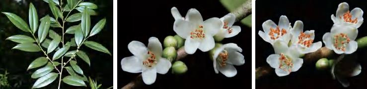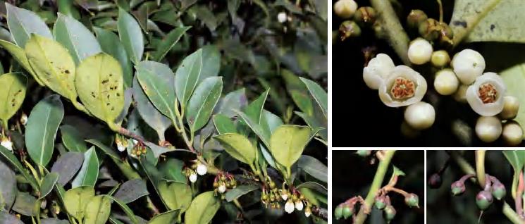 灌木或小乔木。全株无毛;叶革质,长圆形等,顶端渐尖,基部楔形,全缘。花常2~4朵腋生;苞片2枚,早落;萼片5枚,卵圆形或圆形,顶端圆,边缘有纤毛;花瓣5片,白色,倒卵状长圆形;雄蕊25~30枚,花药卵形或长卵形,有丝毛,花丝无毛,药隔顶端有小尖头;子房圆球形,无毛,2室,花柱顶端2浅裂。果实圆球形,熟时紫黑色。花期5—6月,果期10—11月。锦潭管理站联山有分布。
