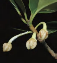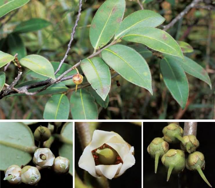 灌木或小乔木。叶互生,厚革质且肥厚,椭圆状卵圆形等,顶端急短尖等,基部阔楔形或钝形,边全缘,干后反卷,有时上半部疏生腺状齿突,下面密被红褐色或褐色腺点;叶柄粗壮。花单朵生于叶腋,杂性;雄花萼片5枚,边缘有腺状齿突,无毛;花瓣5片,白色,倒卵形或长圆状倒卵形;雄蕊多数,花药卵圆形;退化子房微小。果实扁球形,常3~4室,少5室,宿存花柱粗短,顶端3~4浅裂,少5浅裂,果梗粗壮。花期5月,果期8—10月。前进、锦潭管理站前进、联山有分布。