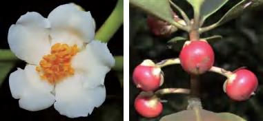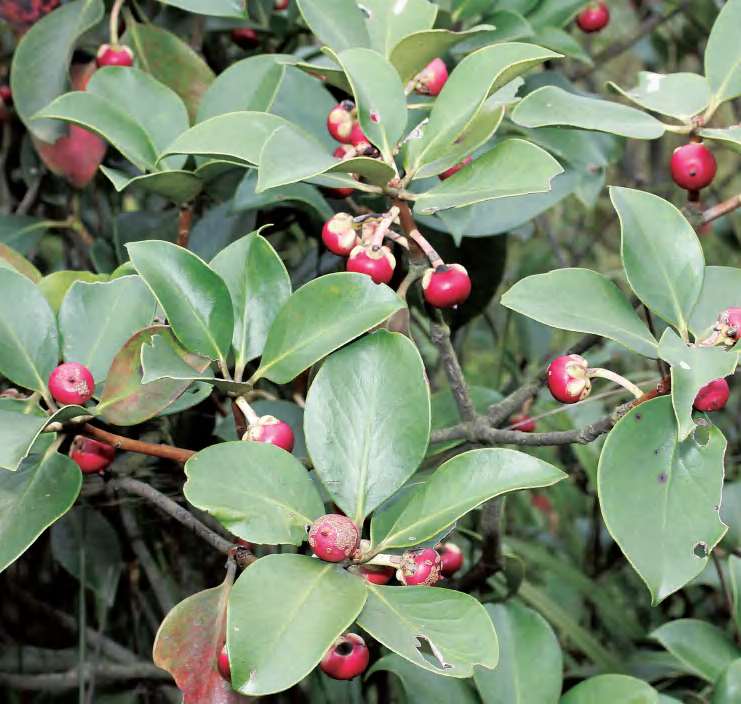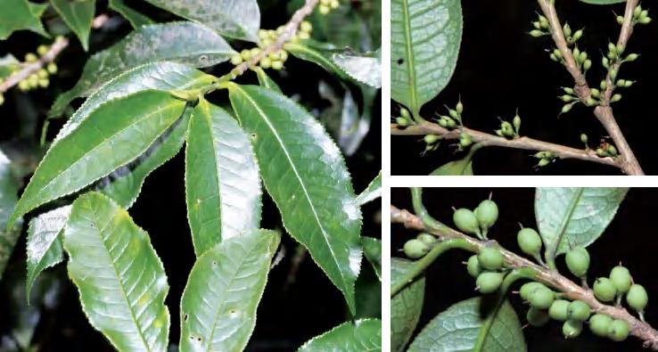 灌木或小乔木。叶革质,长圆状椭圆形等,顶端渐尖,基部楔形,边缘有细钝锯齿。花1~5朵簇生于叶腋。雄花萼片5枚,革质;花瓣5片,白色;雄蕊15~22枚,花药具多分格。雌花萼片与雄花同;花瓣5片,白色;子房圆球形,3室,花柱顶端3裂。果实圆球形,熟时呈紫黑色。花期9—11月,果期翌年6—8月。锦潭管理站联山有分布。