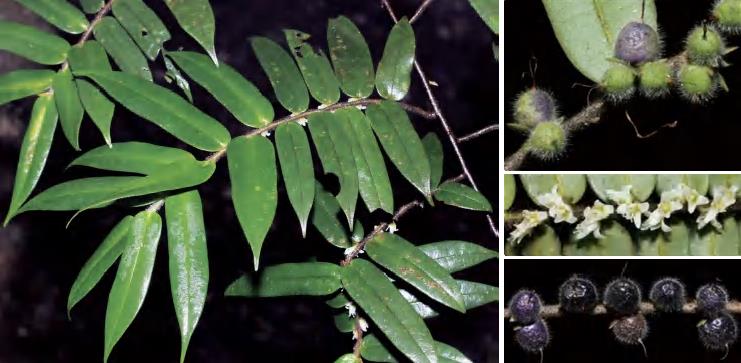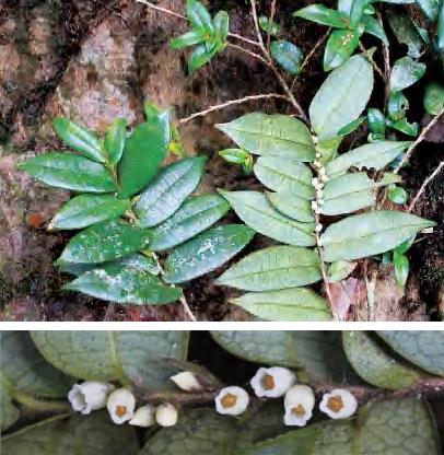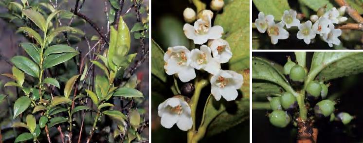 灌木或小乔木。全株无毛;叶革质,长圆形等,顶端渐尖,基部楔形,全缘。花常2~4朵腋生;苞片2枚,早落;萼片5枚,卵圆形或圆形,顶端圆,边缘有纤毛;花瓣5片,白色,倒卵状长圆形;雄蕊25~30枚,花药卵形或长卵形,有丝毛,花丝无毛,药隔顶端有小尖头;子房圆球形,无毛,2室,花柱顶端2浅裂。果实圆球形,熟时紫黑色。花期5—6月,果期10—11月。锦潭管理站联山有分布。