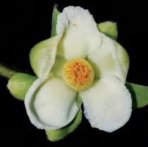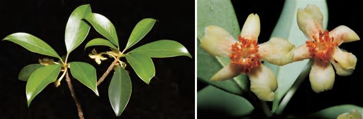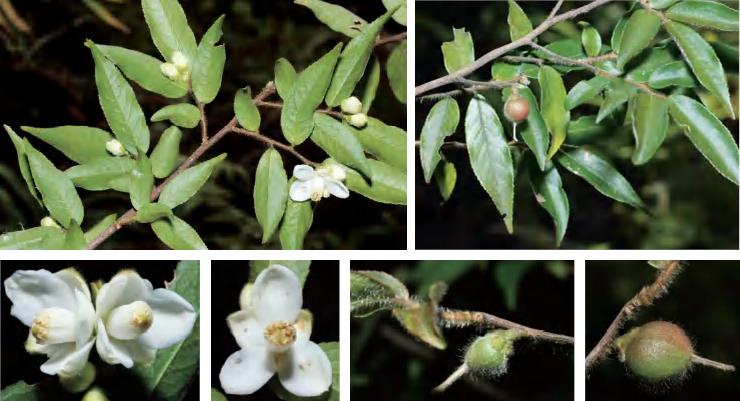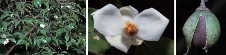 灌木或小乔木。叶互生,厚革质且肥厚,椭圆状卵圆形等,顶端急短尖等,基部阔楔形或钝形,边全缘,干后反卷,有时上半部疏生腺状齿突,下面密被红褐色或褐色腺点;叶柄粗壮。花单朵生于叶腋,杂性;雄花萼片5枚,边缘有腺状齿突,无毛;花瓣5片,白色,倒卵形或长圆状倒卵形;雄蕊多数,花药卵圆形;退化子房微小。果实扁球形,常3~4室,少5室,宿存花柱粗短,顶端3~4浅裂,少5浅裂,果梗粗壮。花期5月,果期8—10月。前进、锦潭管理站前进、联山有分布。