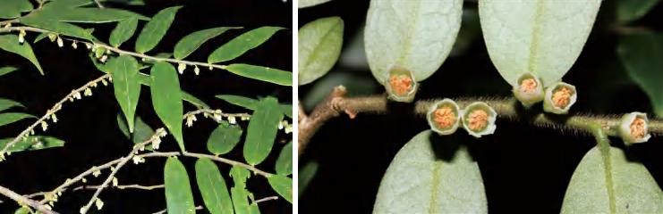 灌木。叶革质,长圆状披针形等,顶端长渐尖,基部钝形,边缘有细锯齿,下面被贴伏绒毛,侧脉约20对;叶柄短,密被绒毛。花1~3朵腋生,花梗被绒毛。雄花萼片5枚,革质,卵形,外面密被绒毛;花瓣5片,长圆形;雄蕊15~19枚,花药具6~8分格;退化子房密被绒毛。雌花萼片和花瓣与雄花同,子房卵球形,密被绒毛,花柱顶端3裂,偶4裂。果实圆球形,密被长绒毛,熟时紫黑色。花期10—12月,果期翌年6—7月。锦潭管理站黄洞、联山有分布。