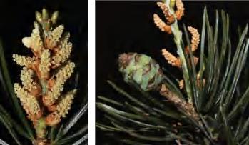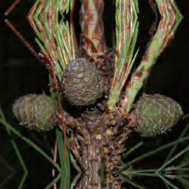 别名青松、山松、枞松。高大乔木。树皮裂成不规则的鳞状块片;针叶2针1束,稀3针1束,两面有气孔线。雄球花聚生于嫩枝下部;雌球花单生或2~4个聚生于嫩枝近顶端,淡紫红色,一年生小球果褐色或紫褐色。球果卵圆形或圆锥状卵圆形,成熟前绿色,熟时栗褐色;鳞盾菱形,鳞脐无刺;种子长卵圆形。花期4—5月,球果翌年10—12月成熟。前进、锦潭、横石塘、云岭、沙口管理站均有分布。可材用,树干可割松脂,树干及根部可入药,树皮可提栲胶。