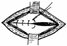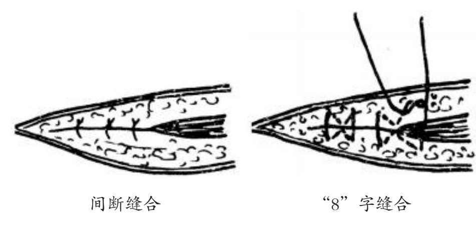 3.缝合方法:通常采用单纯间断缝合,也可采用“8”字缝合(图4-36),连续缝合最好选用铬制线。深部腱膜缝合方法同样可采用单纯间断缝合或“8”字缝合。