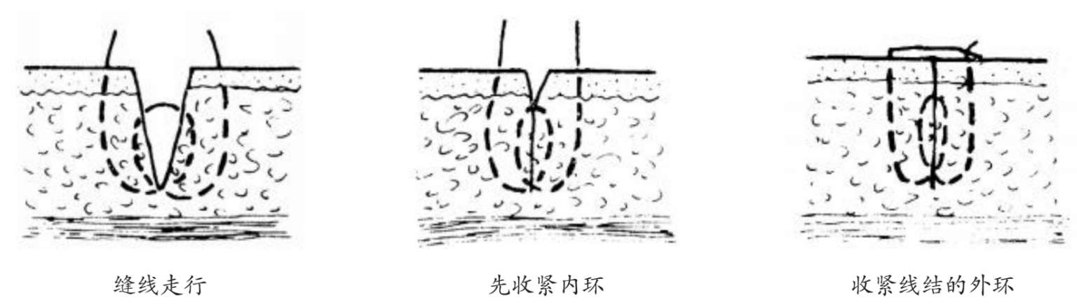 3.缝合方法:①一般采用间断缝合,使两创缘密切接触,游离的或蒂状的脂肪团块要予以剪除,以防脂肪液化。缝合深层脂肪时,最好带着少许深筋膜。对于脂肪较厚又无张力的切口,可采用皮肤、皮下脂肪一次性双环结缝合,结扎时先收紧缝线内环、使皮下脂肪拉拢,再收紧外环,然后结扎(图4-35),术后可将该缝线全部拆除,以减少组织异物反应,但拆线时间需较普通缝合方法延迟2~3天。②皮下筋膜较薄时,可将脂肪层及皮肤一次性缝合。③面、颈部皮肤缝合时,为了使缝合后外形恢复到最佳状态,更要做好皮下浅筋膜的缝合,才能使皮肤缝合时无任何张力。