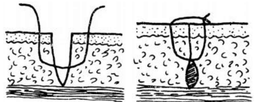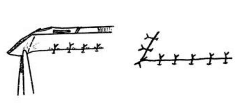 缝合方法分类多种多样,且各类方法互相交叉。按缝线连续与否分为间断缝合与连续缝合,按缝线走向与组织对合线间的位置关系分为水平褥式缝合与垂直褥式缝合,按缝合时的形态分为交锁缝合、“8”字缝合、荷包缝合、半荷包缝合,根据切口形状还有某些相应的特殊缝合方法,如三角形创缘缝合法等(图4-22)。
