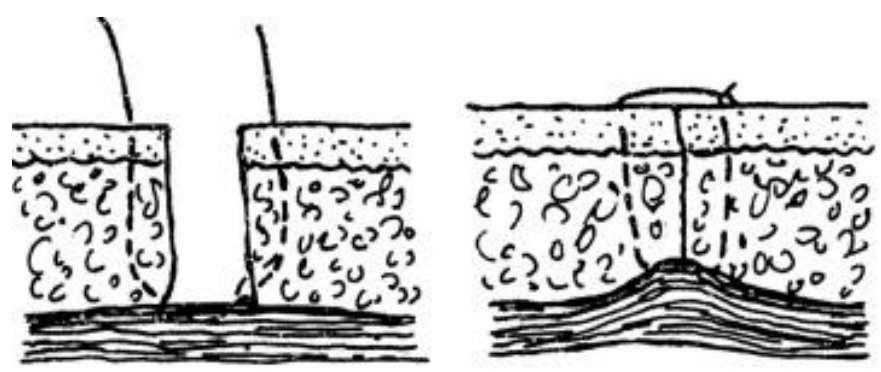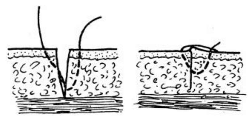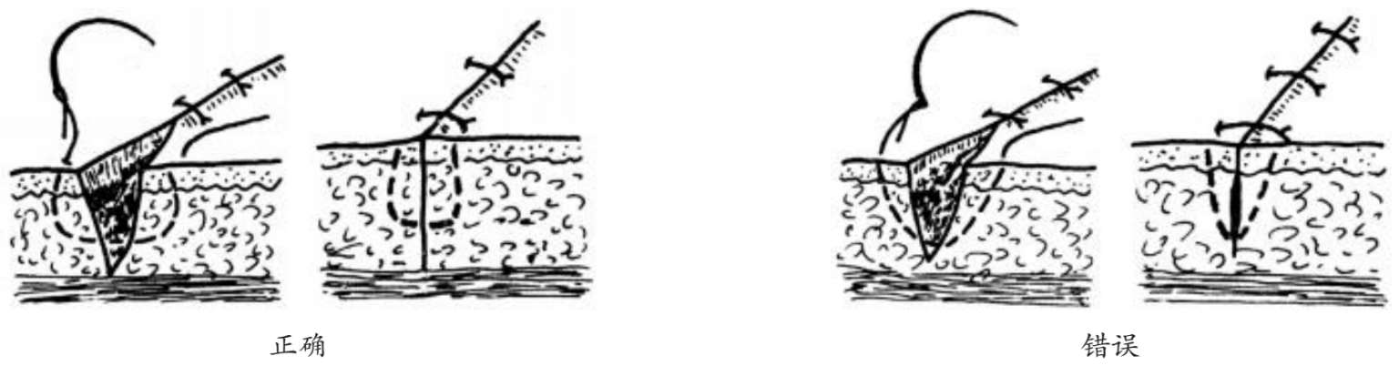 4.要求与注意事项:①缝合后应使皮缘对合良好,创缘皮肤轻度外翻,呈半圆柱状丰满,避免皮缘内翻(图4-26)。②间断缝合后的断面缝线走形应呈梯形,不应呈“V”形(图4-27)。③切口两创缘缝合组织深度相当,防止厚薄不一(图4-28)。④结扎松紧适中,结扎过松组织对合不贴实,易遗留间隙形成积液;结扎过紧被结扎的组织易发生缺血、肿胀、切割、感染。⑤皮肤缝合时,一般要连同适当皮下组织或深筋一块进行(图4-29),防止缝合后遗留死腔形成血肿(图4-30)。⑥双侧皮肤创缘等长时可以从一端开始缝合,双侧皮肤创缘不等长时,则应先分段缝合几针,然后再从每段的中间缝合,将多余的皮肤均匀地分布在每针针距中(图4-31)。⑦一侧创缘皮肤过多出现褶皱,可予以切除后再缝合(图4-32)。⑧针距、边距适当,防止过密、过疏。⑨切口张力较大时应做减张切口,即在受力线上做多个平行于切口的小切口,防止血液循环障碍(图4-33)。缝合完毕后应用纱布卷滚动挤压以排出积血(图4-34)。