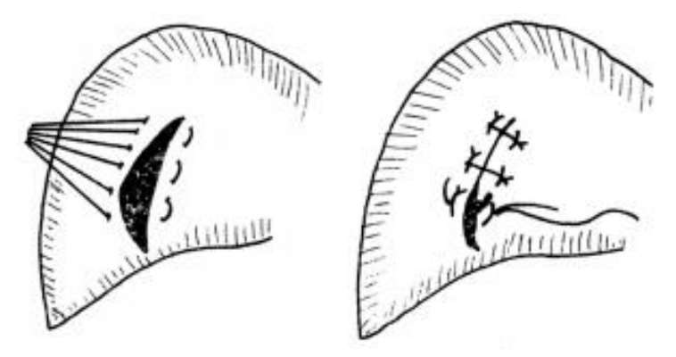 2.缝合线选择:为了避免组织割裂,一般应选择较粗的1号铬制线缝合。