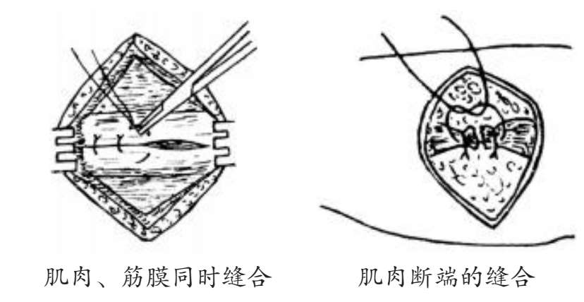 4.注意事项:①结扎时缝线不宜太紧。②大块肌肉横断缝合后,应将肢体置于肌肉松弛位,必要时做适当的石膏固定。