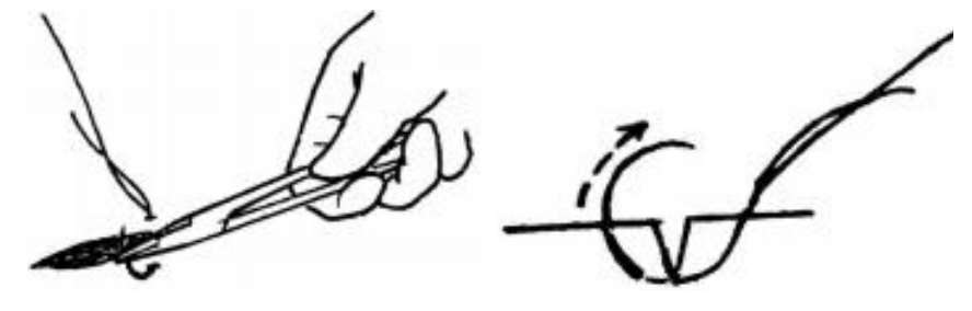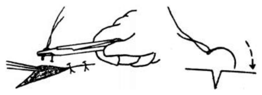 用左手执镊,提起组织边缘,右手执已夹住针线的持针钳,缝合时用腕部及前臂的外旋力量转动持针钳,使缝针进入组织,注意针与被缝合组织呈垂直方向(图4-23),沿针体弧度继续推进使针穿出组织少许。