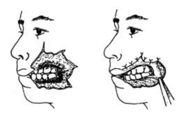 3.缝合方法:①口腔、颊部、上下唇裂伤时,应将皮肤、皮下组织、肌肉层、黏膜层分层缝合。一般采用间断缝合,结扎时注意使黏膜略向外翻(翻向口腔侧或阴道内),结扎用力适当,防止将黏膜“切割”。②有时也可采取连续缝合,对黏膜和黏膜下层小血管有止血作用。③面颊部组织大块全层缺损时,可先将创缘黏膜与创缘皮肤对应缝合(图4-41)。待创口愈合后再做二期修复。