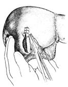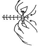 针体的前半部穿过被缝合组织后,即可用镊子夹住针体向外沿针体弧度方向拔针,同时持针钳夹住针体后半部进一步前推,协助拔针。也可由术者将已穿透组织的针体后半部松开,然后用持针钳夹住已穿透组织的前半部,将针拔出。通常操作时缝针前半部穿透组织后,第一助手应该用血管钳协助将缝针拔出,并协助出线,避免线尾脱针或缠绕,以提高效率(图4-24)。
