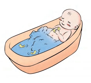 (2)洗澡的环境一定要避风而温暖,水温不可过高,手感温热即可,以36~38°C为宜。