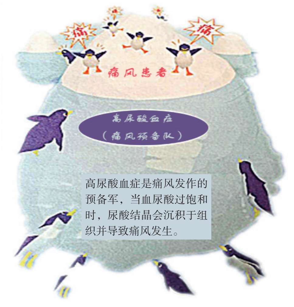 痛风的发生与机体尿酸的代谢密不可分。尿酸是嘌呤代谢的分解终产物,嘌呤又是什么?大家一定知道人类遗传信息的载体是核酸DNA和RNA,而嘌呤就是DNA和RNA的重要组成部分。尿酸的产生依赖于内源性嘌呤的产生和外源性嘌呤的摄入,其中内源性代谢产生的尿酸占80%,外源性食物摄入产生的尿酸占20%,它们都汇入尿酸池,其间约三分之二通过肾脏排出,剩下小部分通过肠道排泄。当身体出现状况如摄入高嘌呤食物过多、先天性代谢酶缺乏、肾功能不全或肿瘤等,即产生和排泄失衡,过量的尿酸就会在体内存留。尿酸是一种较弱的有机酸,当机体处于正常pH值时,约98%的尿酸以尿酸钠水合物的形式存在,尿酸浓度超过420μmol/L(7.0mg/dL)时,尿酸钠水合物超过其血清表观溶解度的极限,则会出现尿酸盐晶体析出。要知道可溶性尿酸盐是不会诱发痛风发作的,只有晶体化的尿酸盐才能促进急性炎症的产生,因此,尿酸盐结晶形成是高尿酸血症发展为痛风的一个关键步骤。超过尿酸盐溶解度阈值后,即血尿酸在体液中处于过饱和状态,此时可有针尖状结晶沉淀并导致炎症发生,因此,高尿酸血症是痛风发作的罪魁祸首。