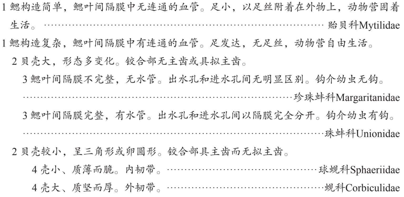 依铰合齿的形态、闭壳肌发育程度和鳃的结构等,分为3个目:列齿目(Taxodonta)、异柱目(Anisomyaria)和真瓣鳃目(Eulamellibranchia)。河流双壳类隶属真瓣鳃目,主要有贝类、蛤类和蚬。真瓣鳃目铰合齿少或无,前后闭壳肌均发达,大小相等;鳃丝和鳃小瓣间以血管相连接;出水孔和入水孔常形成水管。代表种类有:珠蚌科(Unionidae)、蚬科(Corbiculidae)、球蚬科(Sphaeriidae)、贻贝科(Mytilidae)等,珠蚌和蚬类最常见。