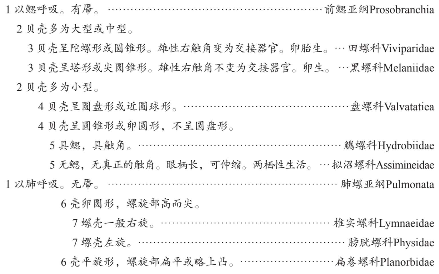 河流腹足类的形态学分类特征主要有:1)壳1个,呈螺旋状,壳口大多具厣;2)头部明显,有眼及触角,口中有齿舌;3)内脏团随螺壳的扭转一般呈螺旋形,左右不对称。