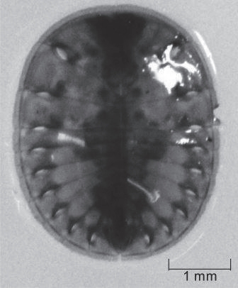 扁泥甲科(Psephenidae,图2-11):体长1.5~6mm;卵圆形,黑色或黑褐色,体背密布短绒毛;头部下弯,下颚须第2节长,端节扁宽;触角细长,稍具锯齿状;前胸背板基部宽,端部窄;前胸腹板突发达,伸于中足基节间;前足基节横形,基前转片明显存在;第3跗节双叶状,第4节小,第5节长于前3节之和,胫节无距;腹部一般可见5节。幼虫蚧虫形,头足等藏于腹下;触角长,2节;足4节;腹部第2~6节具气管鳃。幼虫多发现于急流河段的岩石下。